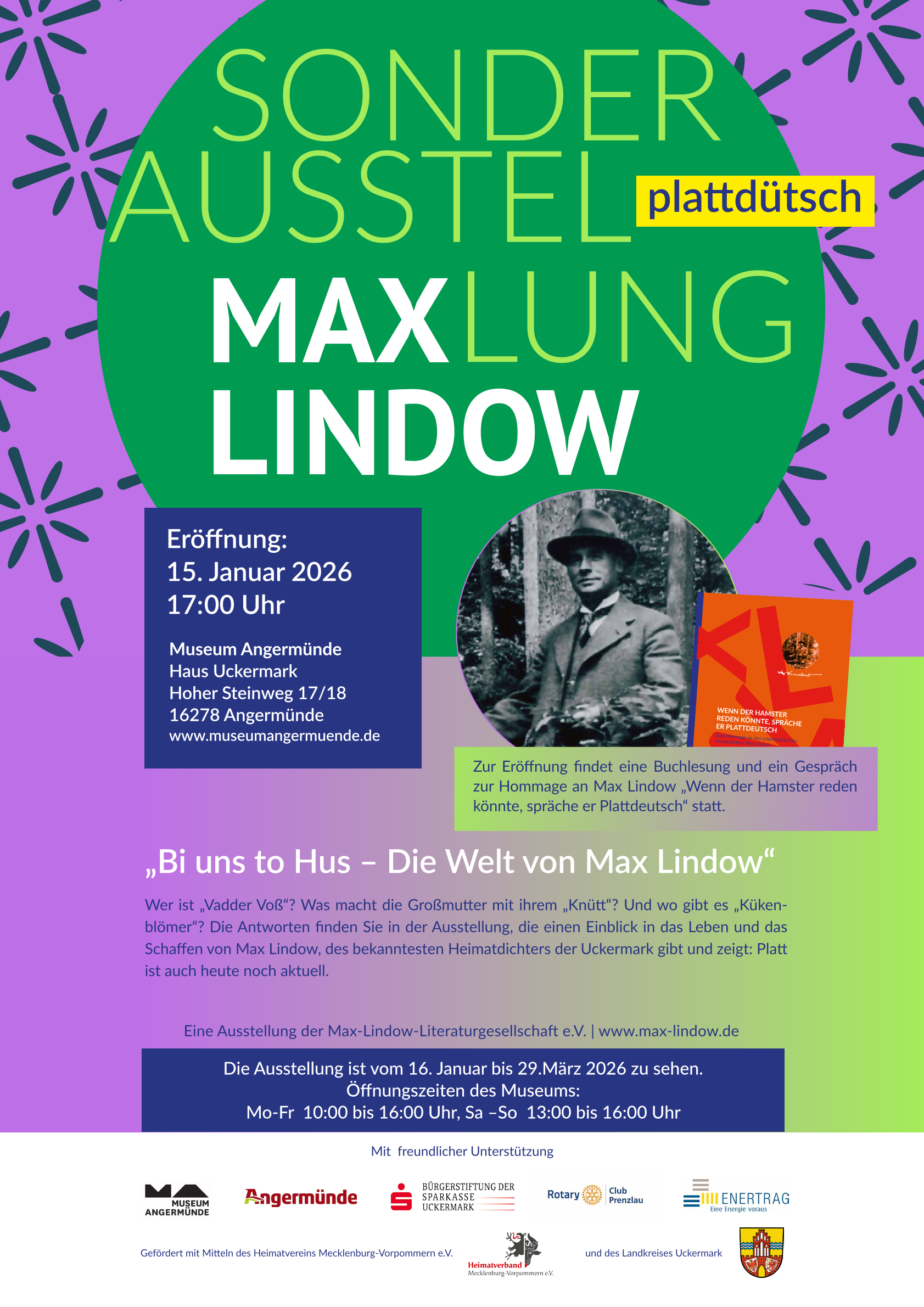 Die Ausstellung wird am Donnerstag, dem 15. Januar 2026 um 17:00 Uhr mit der Lesung der Hommage an Max Lindow im Museum Angermünde eröffnet und ist bis Sonntag, dem 29. März 2026 zu sehen.